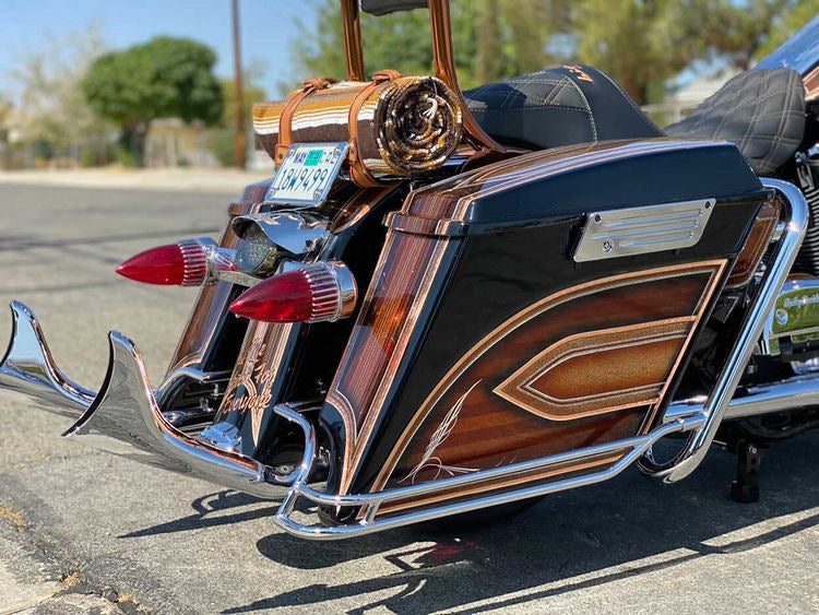 Descargo de responsabilidad: Los protectores traseros y los rieles para bolsas son productos ornamentales/de adorno sin funciones especiales. Todos los protectores y rieles para bolsas están fabricados para adaptarse al chasis/marco de fábrica; si se realizan modificaciones o daños en el chasis, es posible que el montaje no funcione debido a los cambios. Para motocicletas bajadas, como la holgura del guardabarros cuando la suspensión está comprimida y la holgura del brazo oscilante. Los protectores están diseñados para ser compatibles únicamente con tubos de silenciador de 2,5" de diámetro o menos. Los rieles requieren espacio en la parte trasera entre el guardabarros y las bolsas. Si el cliente usa cubiertas de espacio extendidas, los rieles no tendrán espacio y, por lo tanto, no Los rieles SCC se hicieron para bolsas con un diámetro delgado y extendido hacia abajo. No son compatibles con las bolsas de abajo y fuera del mercado NO están disponibles para softail 2018 y superiores. El producto no viene con hardware. responsable de cualquier daño. La garantía no es válida si las piezas no son instaladas por un distribuidor aprobado de SCC.