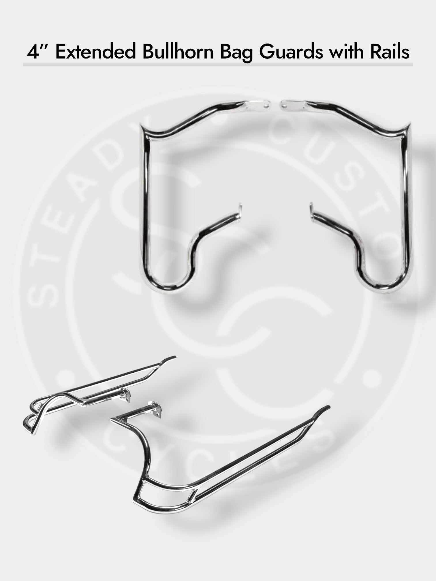 ¡Los protectores de bolsas extendidos Bull Horn de 4 ″ de Steady Custom Cycles se producen como ningún otro protector de bolsas en el mercado! ¡Extendido 4″ para cubrir bolsas estiradas de 4″! Steady Custom Cycles construyó los protectores de bolsas extendidos Bull Horn de 4 ″ para resolver el problema de los protectores de bolsas cortos que todos enfrentan cuando extienden sus bolsas. ¡Construido con tubos grandes de 1,25 ″ para lograr esa apariencia gorda y musculosa!