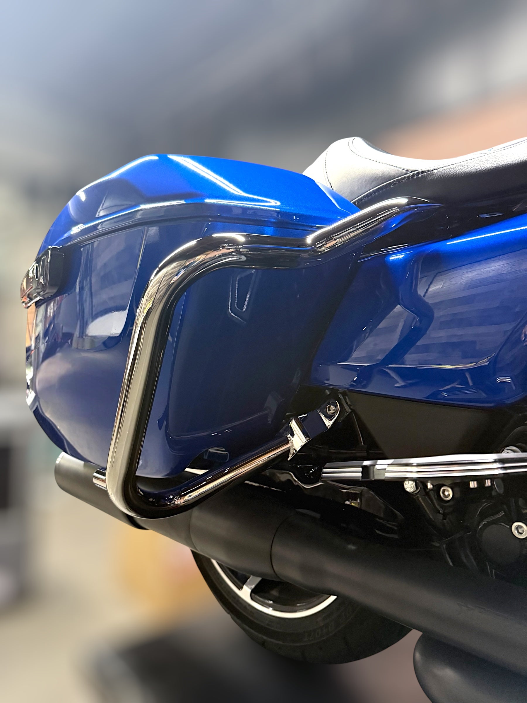 These will follow the flow of the stock bags from the 2023 touring/bagger models. The new models have stock "stretched bags". It's extended on the rear of the bags but not the front, leaving like a slope at the bottom. Our rails follow that slope to perfectly trim the bottom and adds protection to the bags, if the bike were to ever tip over.