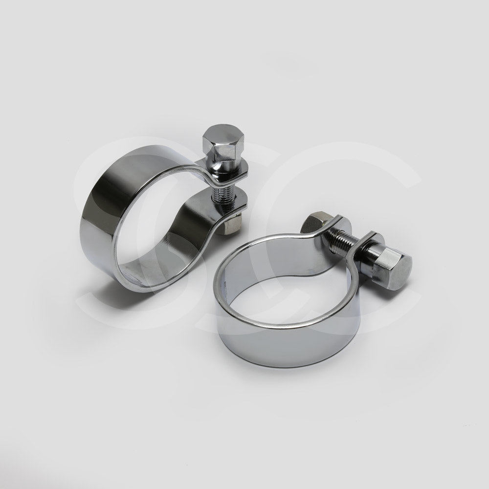 1-7/8″ Chrome slip-on pipe clamps. These clamps will allow you to secure any Steady Custom Cycles slip-on pipes, such as the Fishtail, Sharkfin, Straight Pipes, Slash Cut, etc. to your head pipes/headers. These chrome clamps are slim, strong, and great looking!