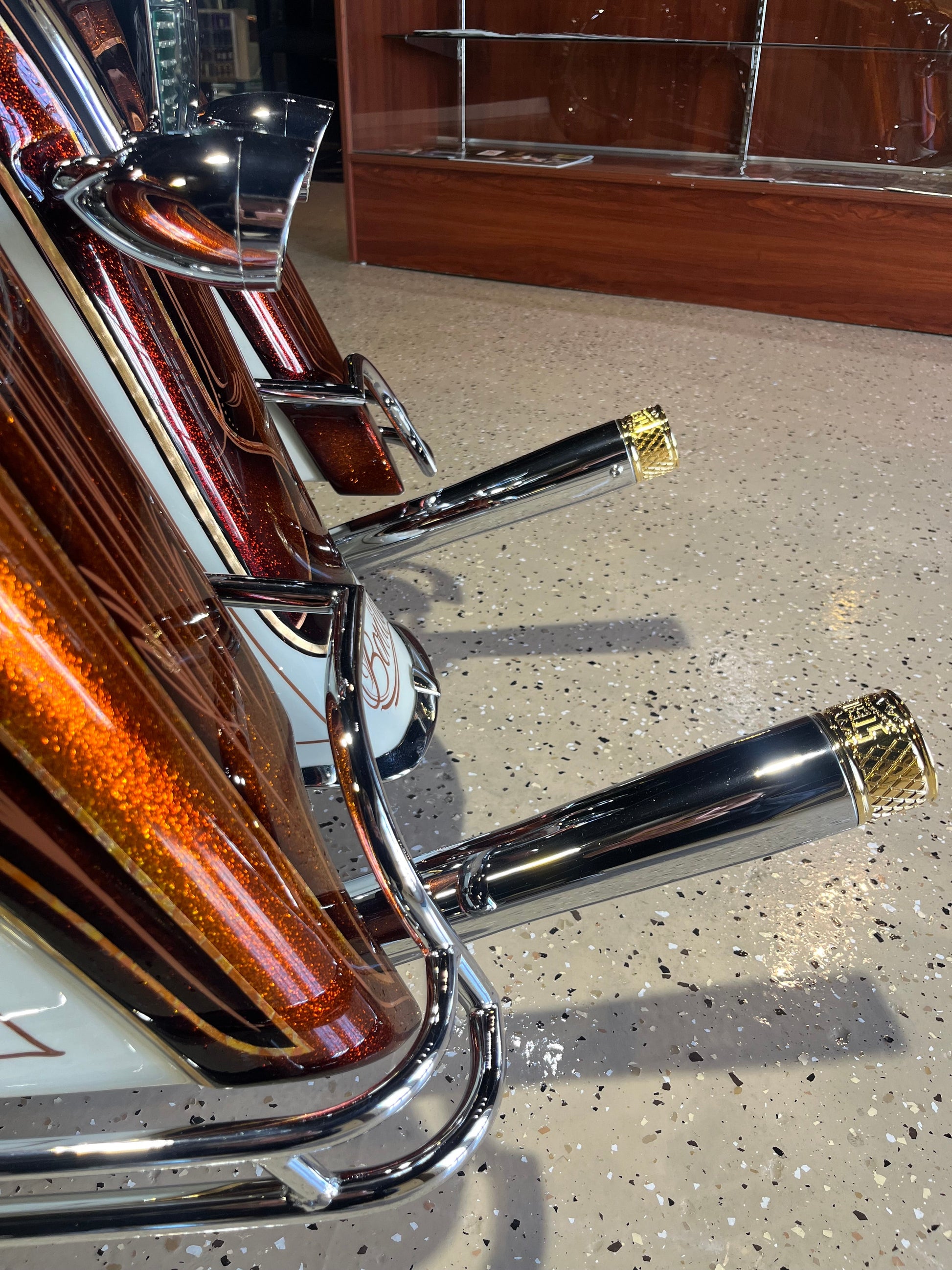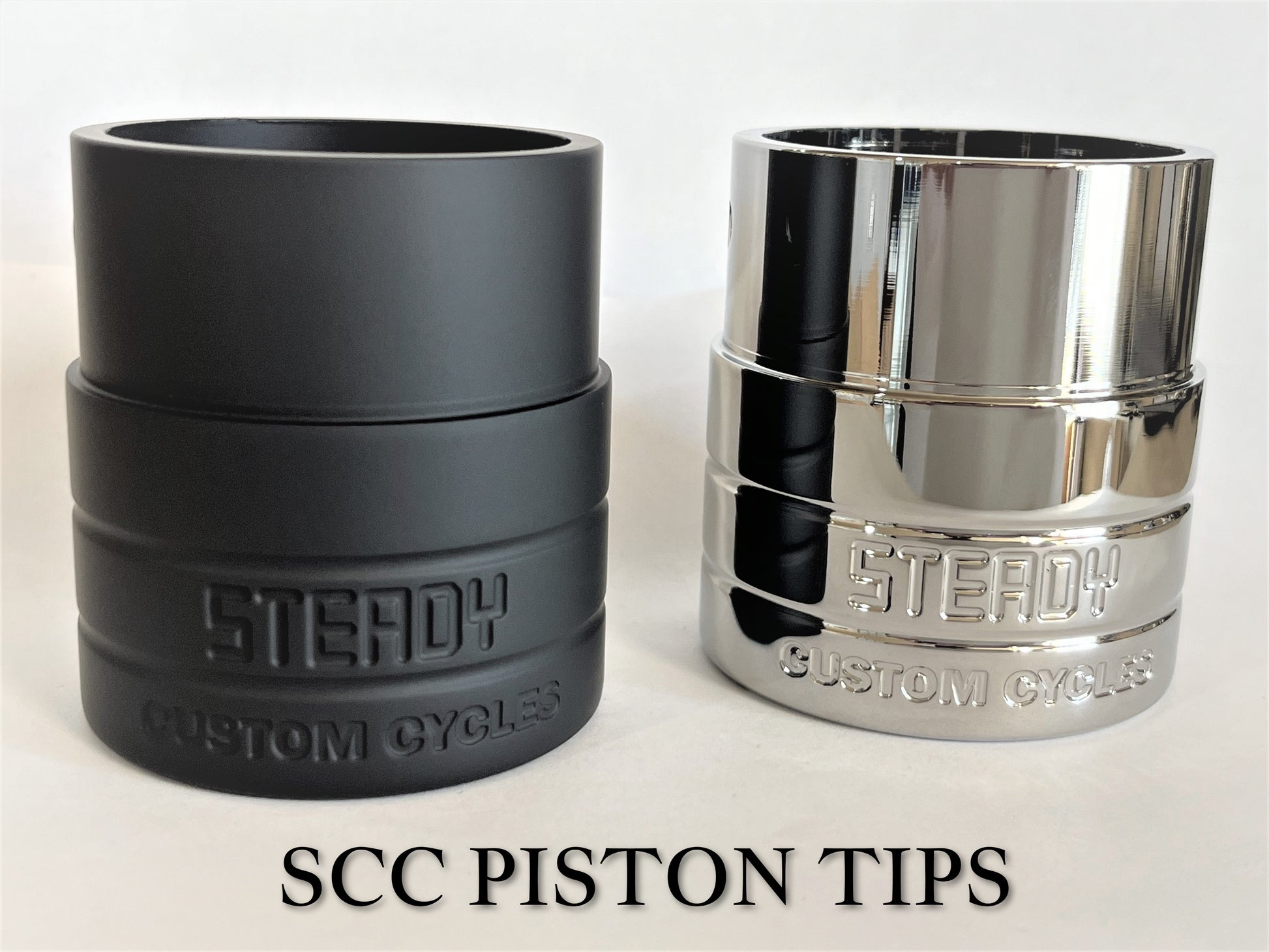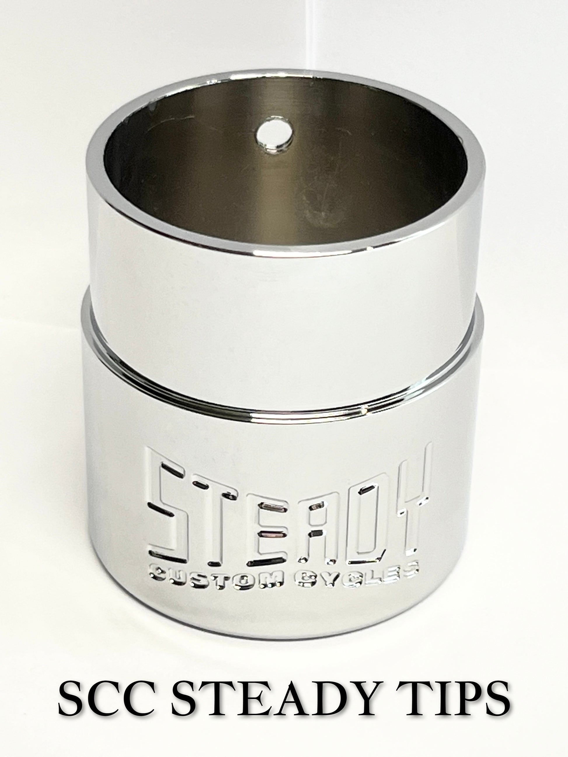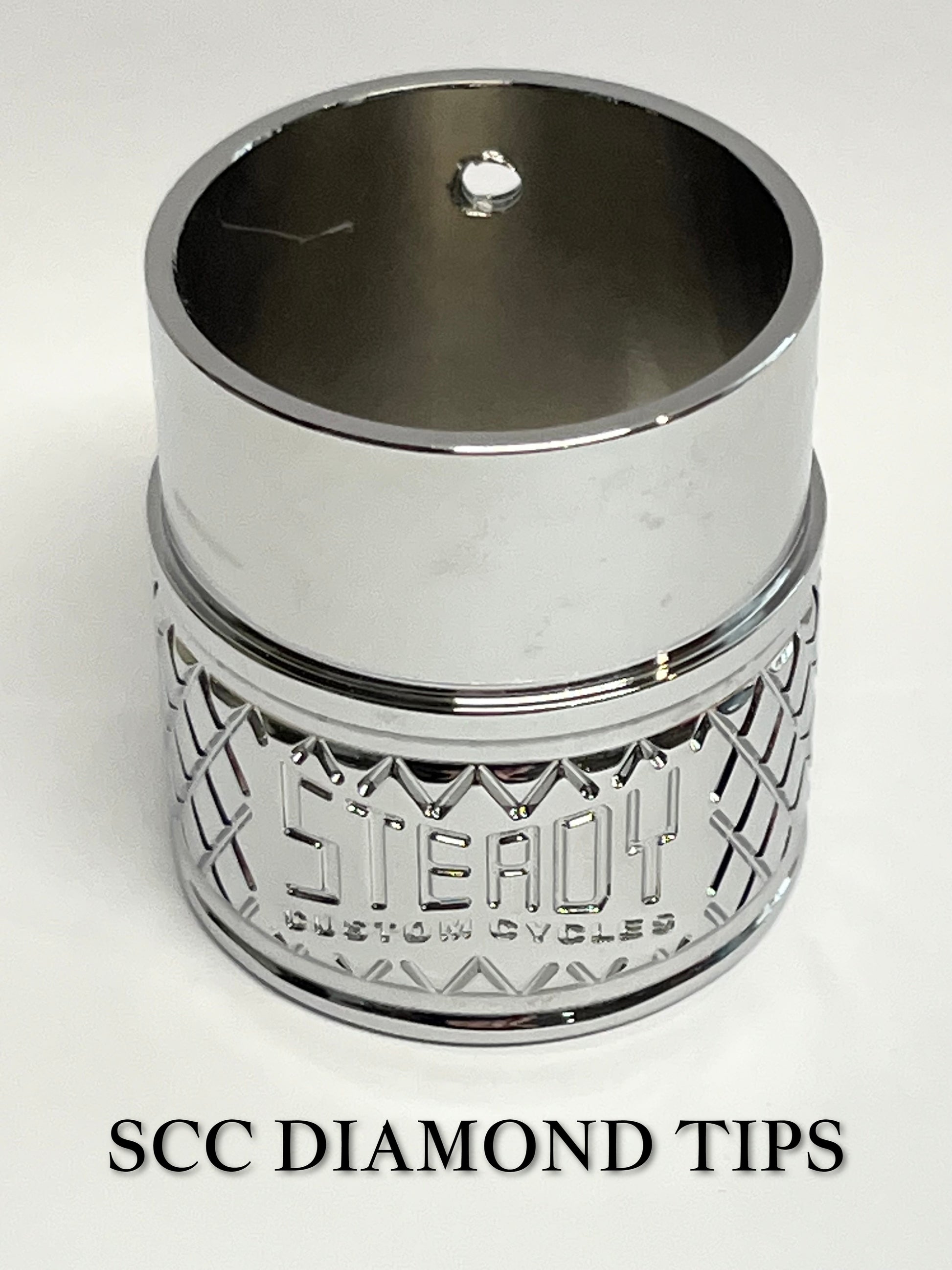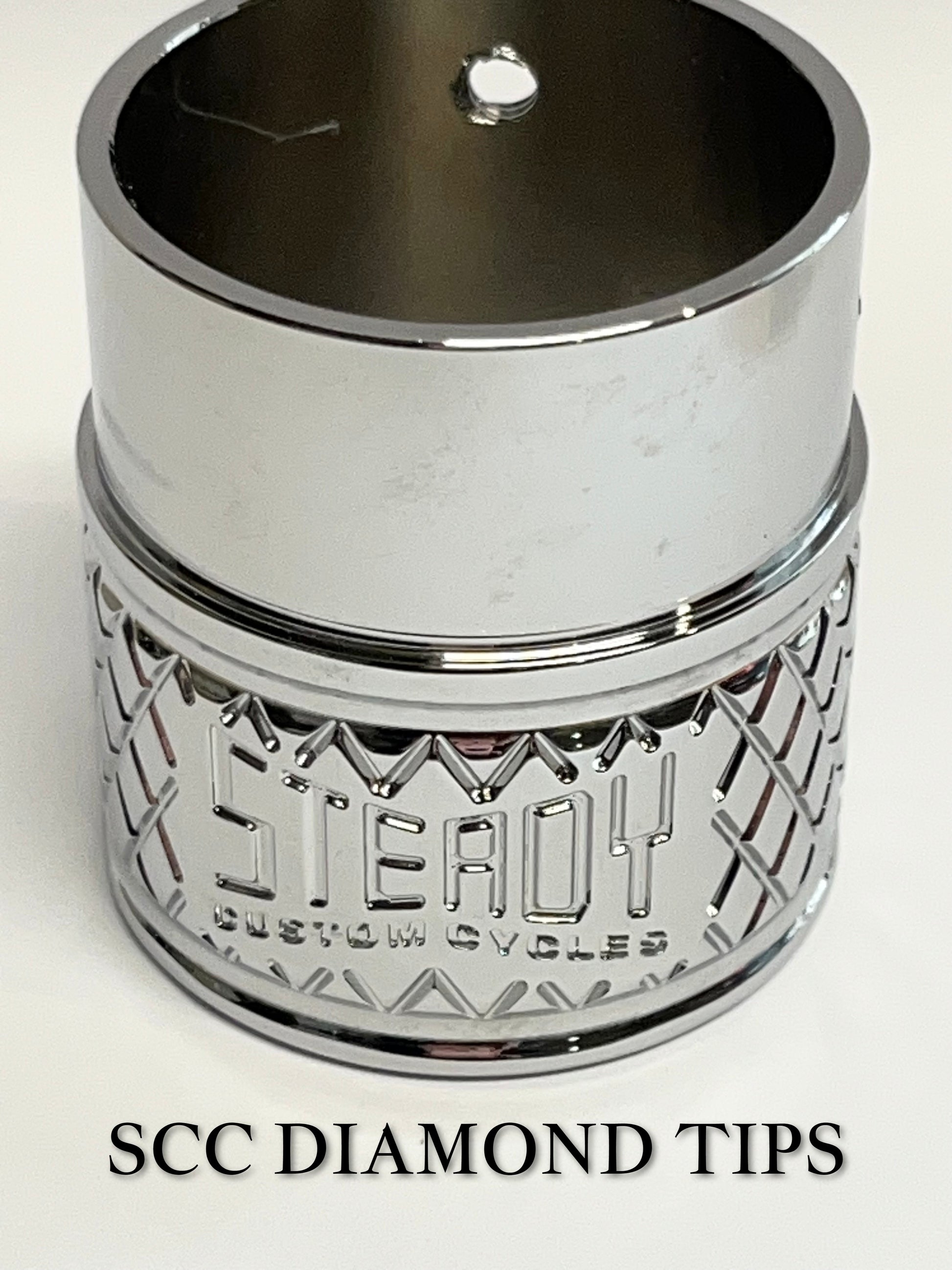 Add a touch of style to your exhaust pipes. SCC Exhaust Tips are available in chrome, copper, yellow gold, and cerakote black with different designs to make sure your exhaust tips are not plain. We have the STEADY tips which is our original exhaust tips. These are clean and basically an extension of the average straight pipe but with our logo engraved on to the set. There is also the PISTON tips which have an old school feel to it, with a design that appears to be 3 rings together and our Steady Custom Cycles name engraved on the tips. The last style is the DIAMOND tips, this style has been proven popular amongst those using the Cycle Smith floor boards.