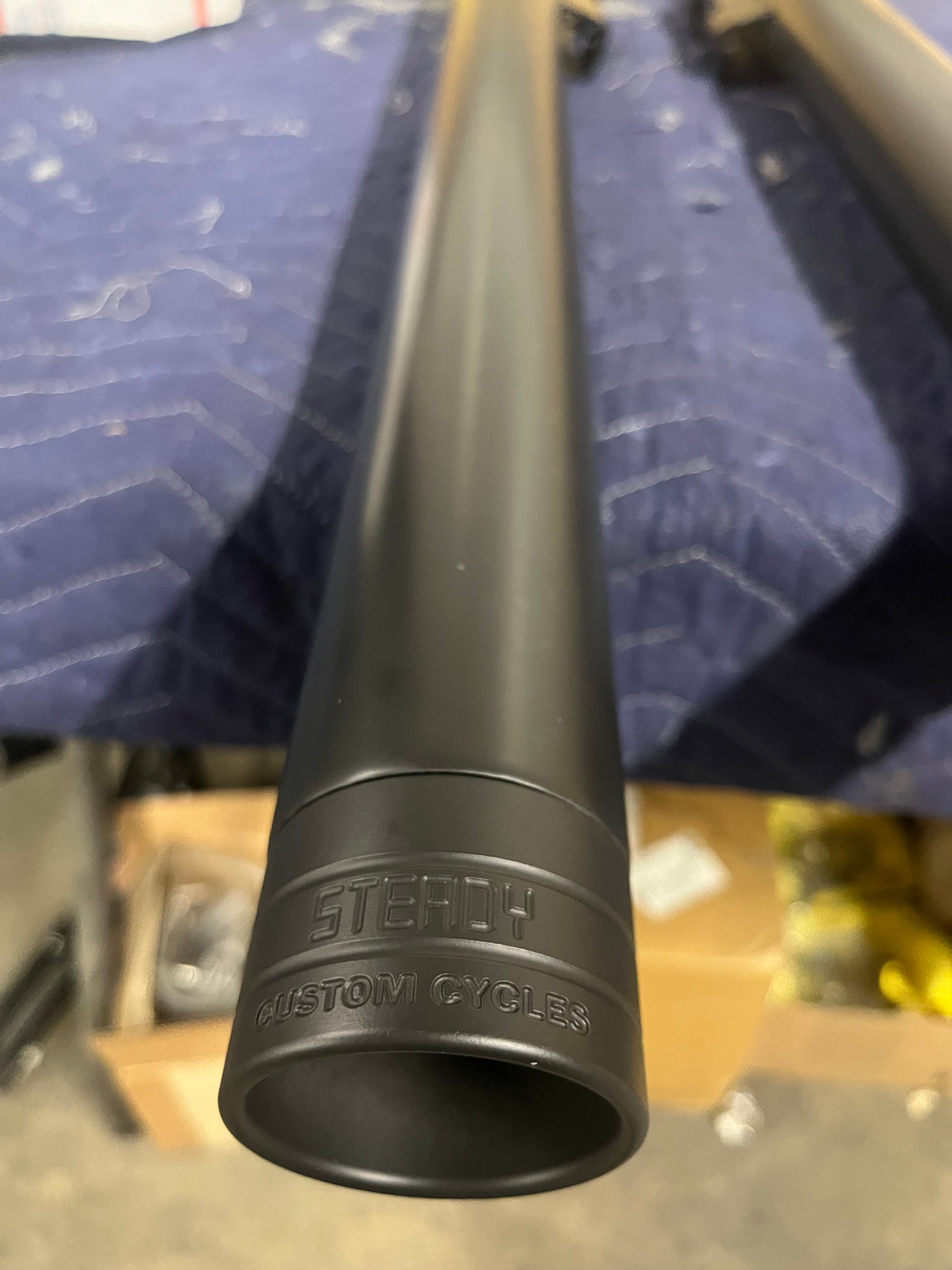 Pipes Warranty: Our slip-on pipes and tips are warranted against defects in material and/or workmanship for a period of 90 days. The following models are not covered by our warranty 1997-2016 Touring/Bagger. Our warranty does not cover finishes such as plating, or painted surfaces with discoloration or rust. This warranty shall be limited to the repair or replacement of the system, which may be proven defective under normal use. We will not warranty any system that has been abused, misused, improperly installed, modified, or damage during impact (scrape the curb, accident, etc.). Intended for use with stock engine settings only. Please use lock tight on the exhaust tips. Replacement will be charged for full price of new set or single piece for lost or damaged tips. Steady Custom Cycles muffler pipes are ornamental and not intended to improve performance.