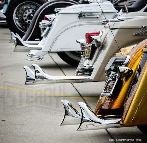 NOTE: Steady Custom Cycles Pipes does not have heat-shields, the pipes are 100% visible. Discoloration on the pipe could occur if the engine is not tuned. Tuning your bike is highly recommended when changing the pipes out.