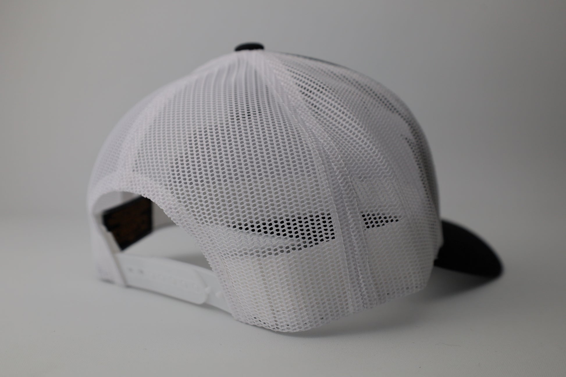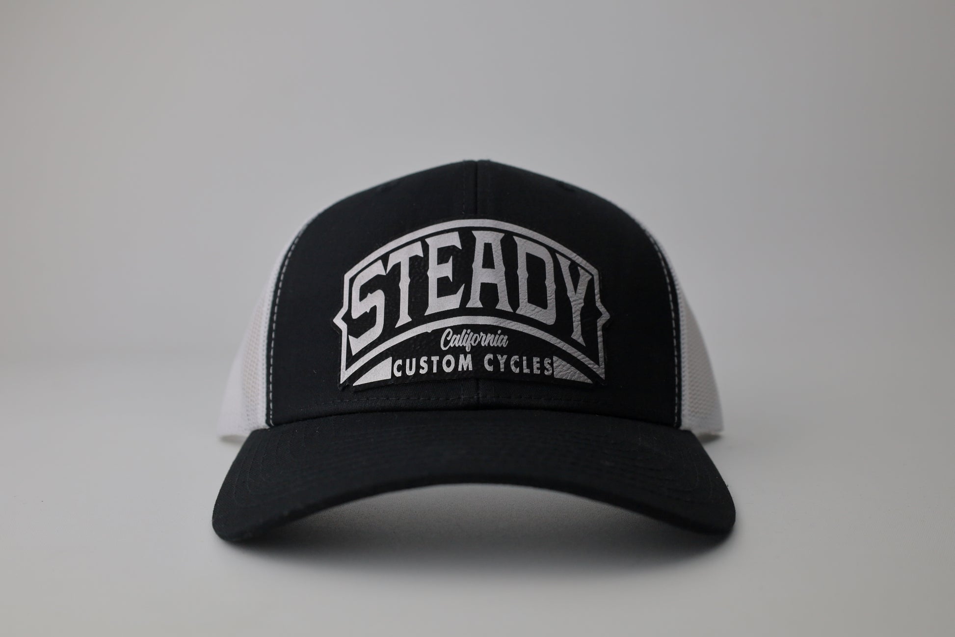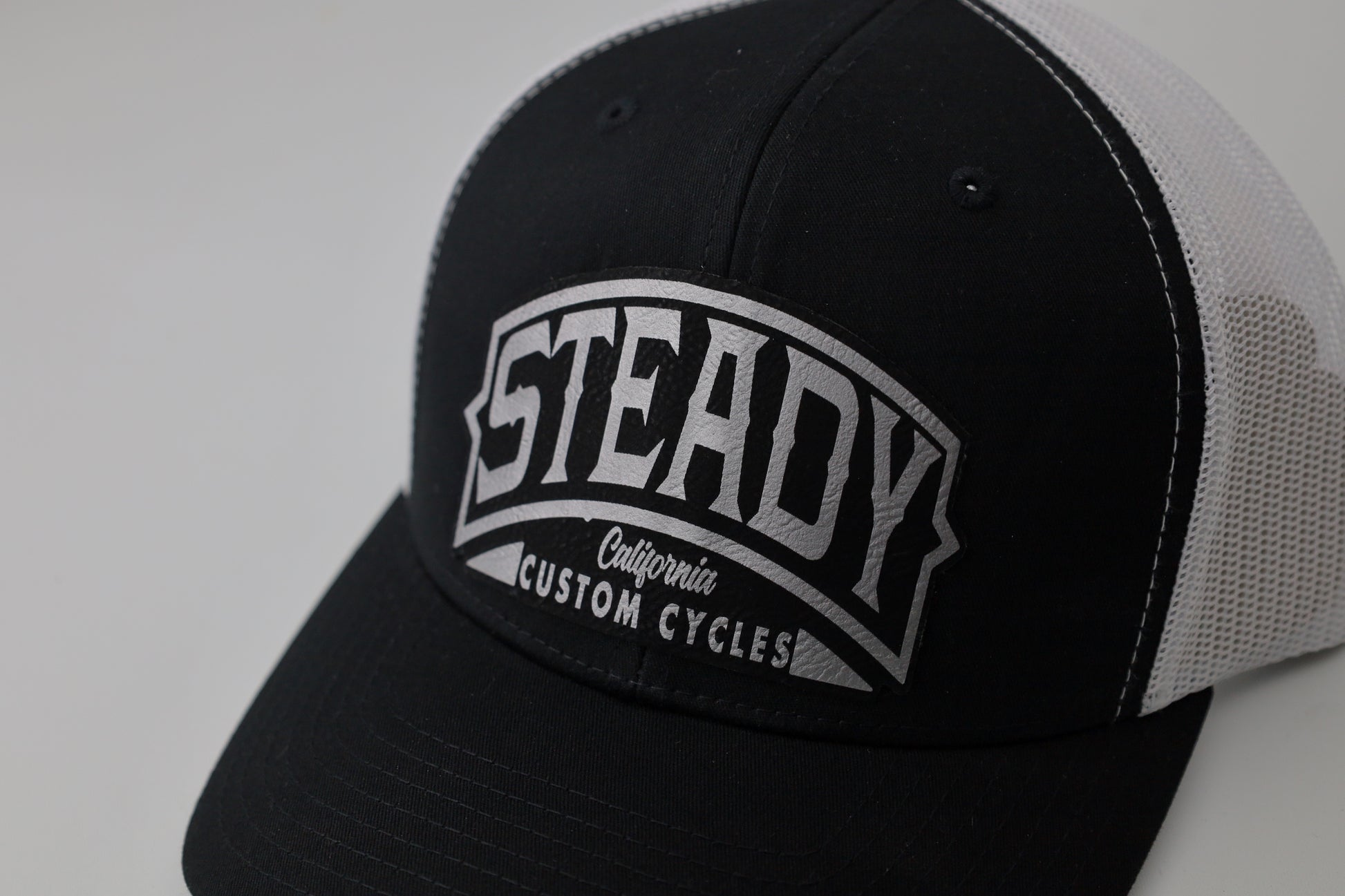 Leather patch design (silver color with black on the black and white hat)