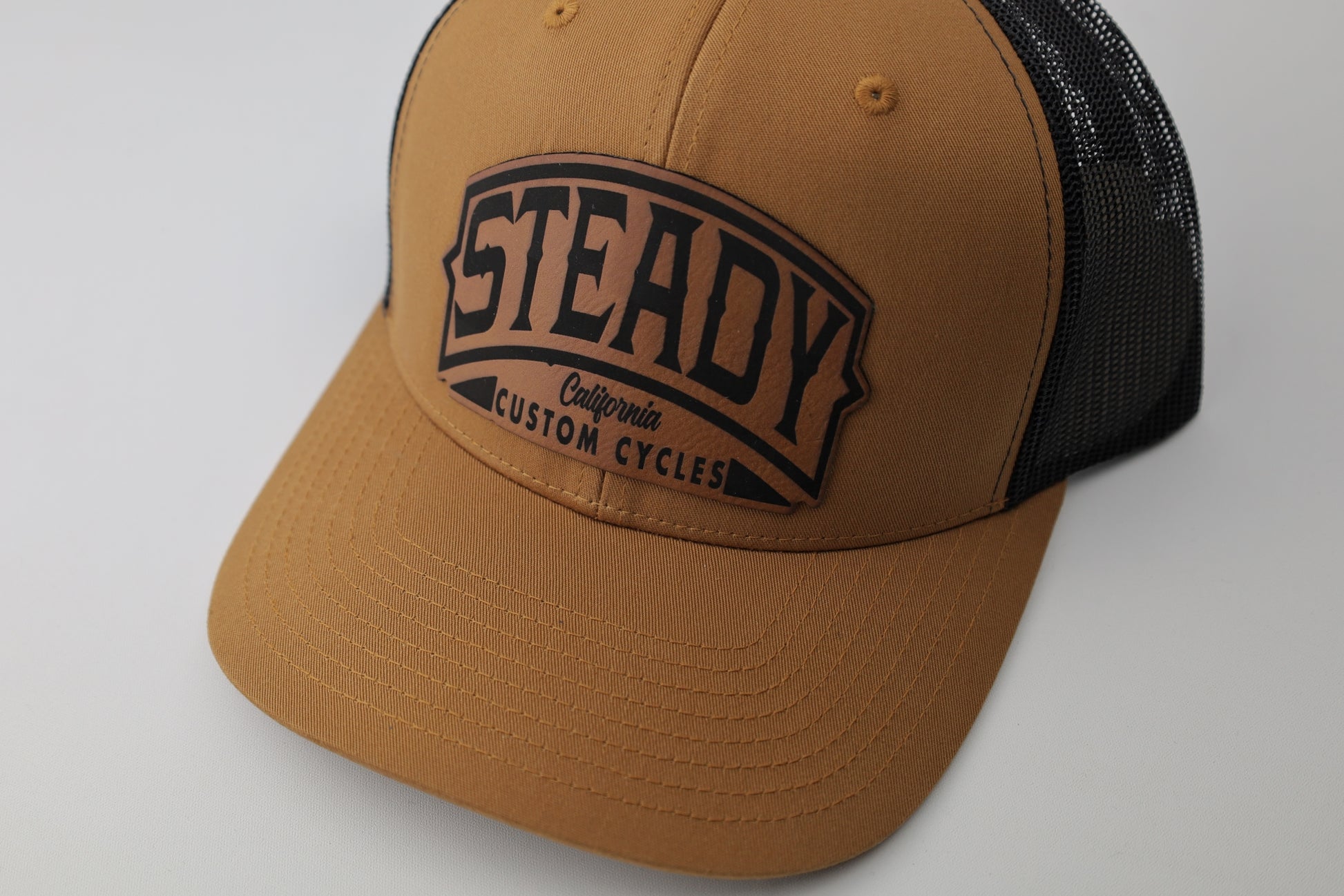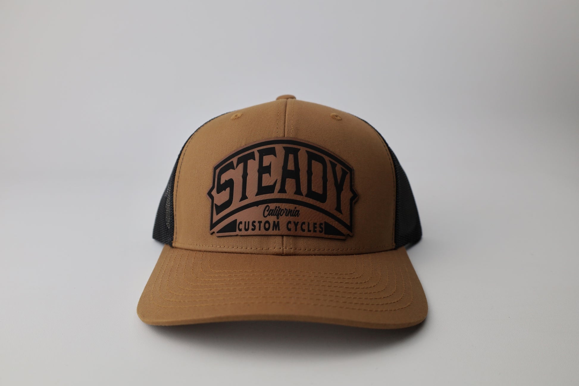 Leather patch design (brown with black color on the patch on the brown with black hat)